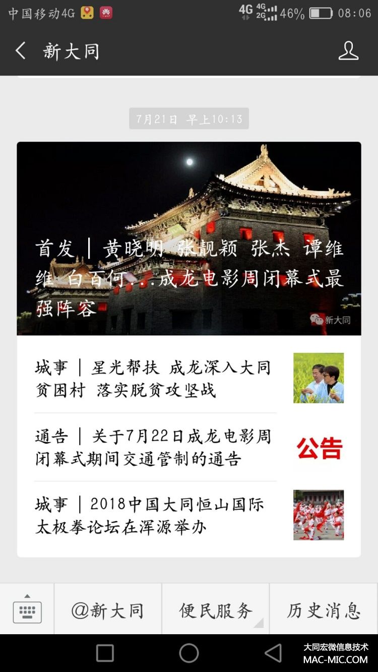 7月21日,由宏微信息技術(shù)旗下新大同微信平臺首發(fā),新大同網(wǎng)、今日頭條新大同號,搜狐新大同號等全媒體陣容推出的《首發(fā) | 黃曉明 張靚穎 張杰 譚維維 白百何...成龍電影周閉幕式最強(qiáng)陣容》一文在網(wǎng)絡(luò)一經(jīng)推出就開始熱傳。成龍電影周在大同舉辦,閉幕式廣受關(guān)注,新大同內(nèi)容發(fā)送及時,內(nèi)容獨(dú)特,編排新穎,受到眾多關(guān)心大同旅游發(fā)展、關(guān)系成龍動作電影節(jié)的網(wǎng)友一致好評。
