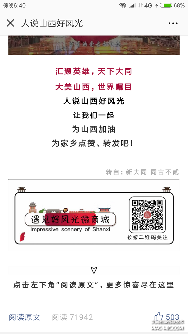 截止發(fā)稿時,新大同原創(chuàng)微文《首發(fā) | 黃曉明 張靚穎 張杰 譚維維 白百何...成龍電影周閉幕式最強(qiáng)陣容》在人說山西好風(fēng)光的閱讀量已經(jīng)達(dá)到7W+,新大同平臺通過不斷完善創(chuàng)新發(fā)展,為我們大同旅游、為山西旅游發(fā)展不斷貢獻(xiàn)自己的小小力量。