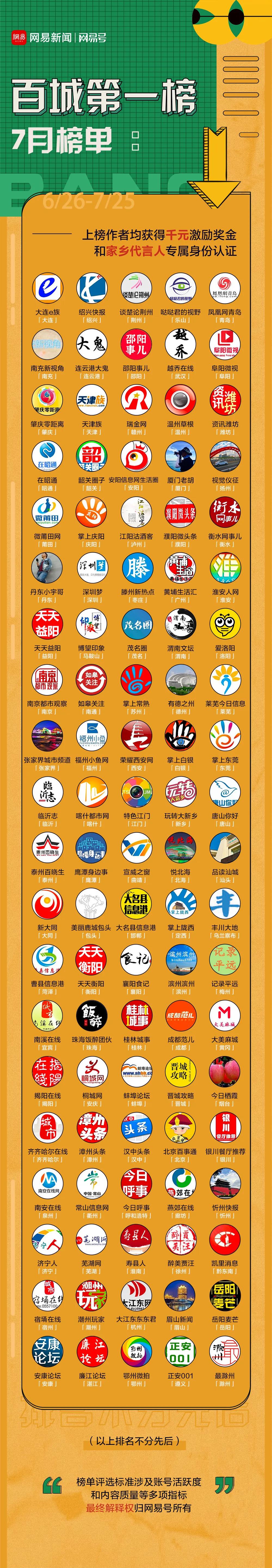 網(wǎng)易號(hào)“尋找家鄉(xiāng)代言人”系列扶持計(jì)劃之百城第一榜,旨在獎(jiǎng)勵(lì)為用戶提供多元化本地內(nèi)容的優(yōu)質(zhì)本地作者。升級(jí)版“百城第一榜”專注于扶持創(chuàng)作方向?yàn)楸镜爻院韧鏄贰⒈镜厣鐣?huì)熱點(diǎn)、本地人文歷史的自媒體作者。榜單根據(jù)本地作者的發(fā)文數(shù)量、發(fā)文質(zhì)量、原創(chuàng)度、活躍度和互動(dòng)等多重?cái)?shù)據(jù)表現(xiàn)進(jìn)行評(píng)選。上榜賬號(hào)可獲得千元現(xiàn)金獎(jiǎng)勵(lì)、“家鄉(xiāng)代言人”專屬身份認(rèn)證和運(yùn)營(yíng)一對(duì)一發(fā)文指導(dǎo)等多項(xiàng)福利。