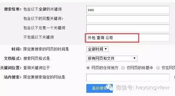 我們可以利用高級搜索工具對搜索結(jié)果頁面進(jìn)行篩選,比如我們查詢“seo”關(guān)鍵詞,但是我們不想看出現(xiàn)seo外包,seo公司,seo查詢這一類的網(wǎng)站的,此時我們就可以在,限制關(guān)鍵詞中添加“外包 查詢 公司”即可;