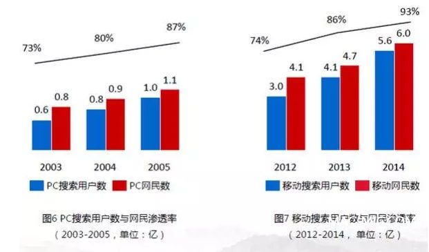 移動(dòng)搜索的發(fā)展歷程與早期的PC很相似,不過移動(dòng)搜索的發(fā)展更為快速。據(jù)百度2015年初發(fā)布的《移動(dòng)互聯(lián)網(wǎng)發(fā)展趨勢報(bào)告》顯示,移動(dòng)搜索已成為用戶規(guī)模僅次于社交通信的第二大應(yīng)用垂類,且移動(dòng)用戶的搜索需求(人均搜索次數(shù))呈現(xiàn)穩(wěn)步提升趨勢。此外,百度移動(dòng)搜索流量也已超過了PC搜索。