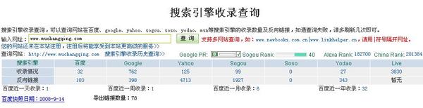 通過圖3大家可以發(fā)現,通過這個網站查詢能夠一次性查出該網站各個搜索引擎的收錄和反向鏈接情況。還能查到googlePR值和sogouPR值。ALEXA排名和中國網站排名也一次性都查了出來。另外還有該網站的百度最近的收錄情況,百度快照日期,網站導出的鏈接數量等等。一次性把網站很多重要的質量指標都查了出來。這樣大家想了解自己網站和合作網站的基礎質量情況的時候,就可以通過這個工具一目了然。