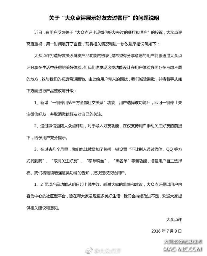 對此,大眾點評通過官方微博發(fā)布聲明,對因相關(guān)產(chǎn)品功能給用戶造成的困擾表示誠摯道歉,并提出了三條整改措施,包括新增“一鍵停用第三方全部社交關(guān)系”功能;通過微信登錄并導(dǎo)入好友關(guān)系,在支持用戶手動關(guān)注的情況下給予充分提示;增加包括一鍵設(shè)置“不讓別人通過微信、QQ等方式找到我”“取消關(guān)注好友”“移除粉絲”“黑名單”等新功能。