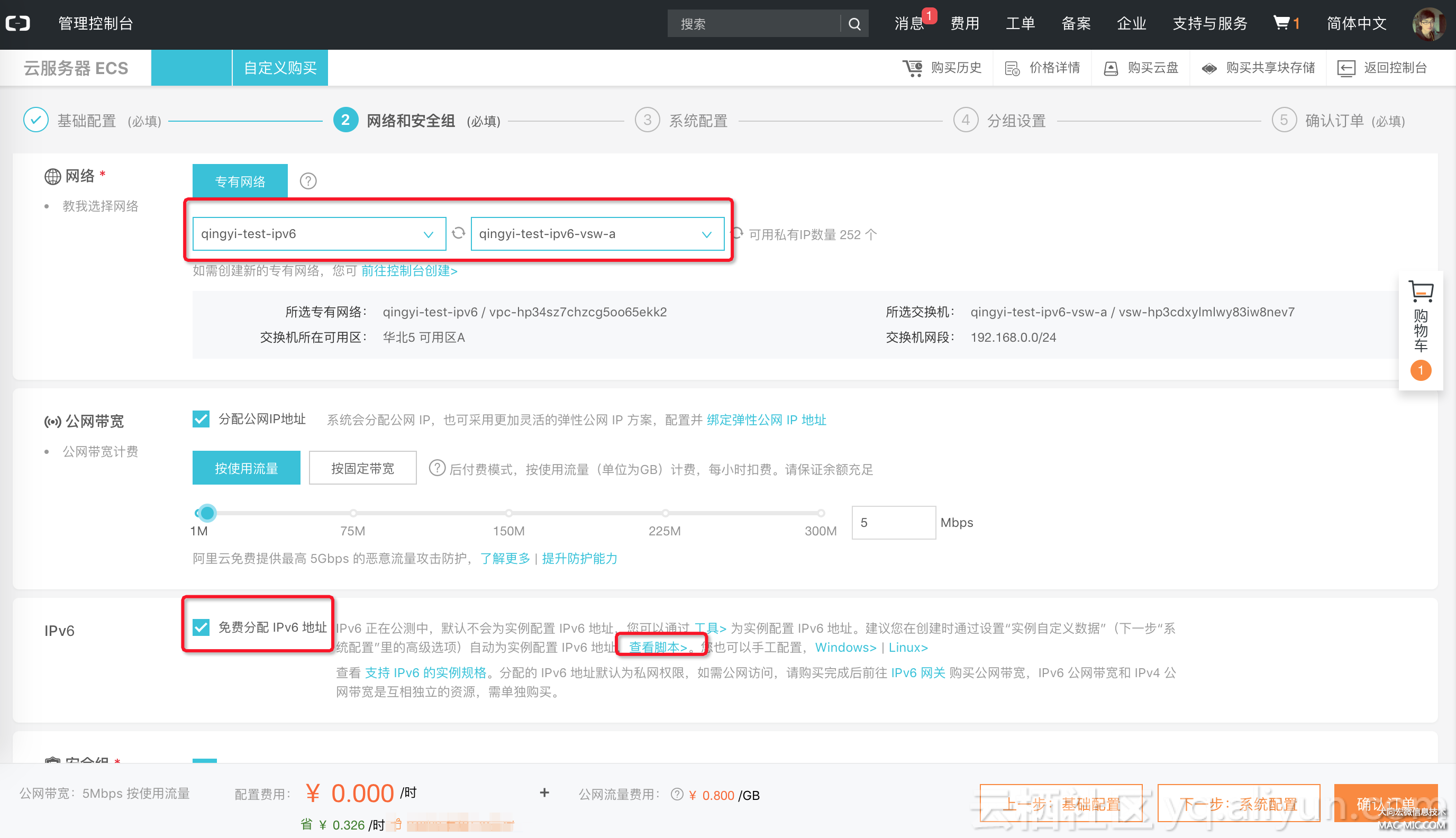 在第二步選擇剛創(chuàng)建好的 VPC / 交換機,然后勾選 免費分配 IPv6 地址,如下圖所示: