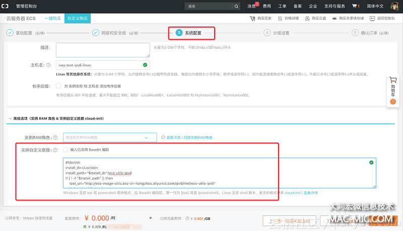 為了便于測試建議勾選 分配公網 IP 地址,此公網 IP 地址為 IPv4。根據頁面提示,在公測期間需要為實例配置 cloud-init 腳本即 實例自定義數據(暫時需要手工配置,未來系統(tǒng)會自動處理),如下圖所示:
