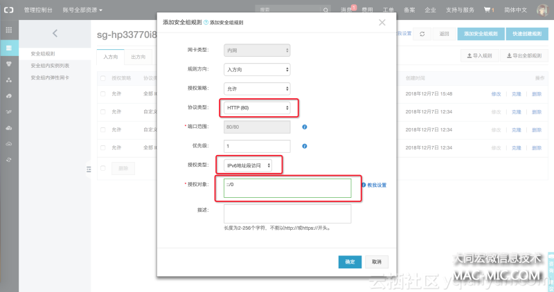 如果您的本機網絡支持 IPv6,可以為該實例 開通 IPv6 網關公網帶寬,然后直接在本地瀏覽器里輸入 http://[your_ipv6_address] 即可訪問, 需要注意在該實例的安全組里配置 IPv6 入方向 80 端口。如下圖所示: