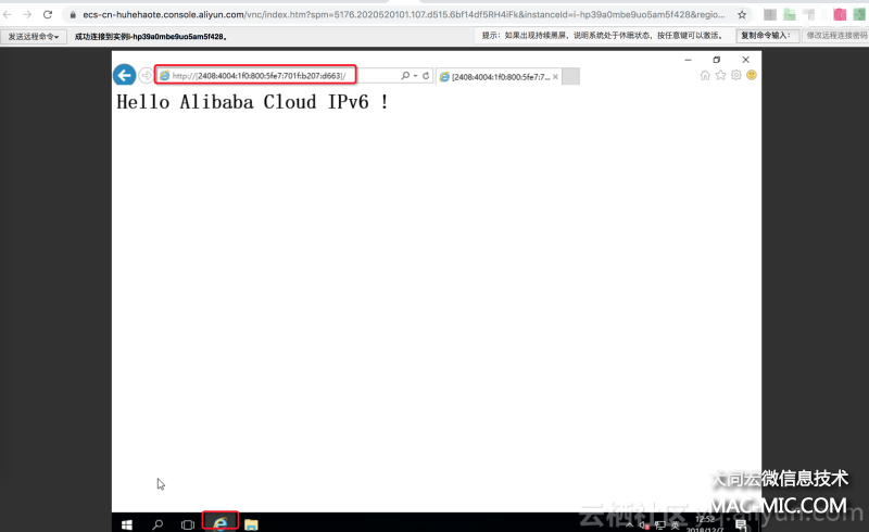 筆者由于本地網絡不支持 IPv6,因此又用上述步驟購買了另一臺 Windows 實例(配置好 IPv6),然后通過 VNC(控制臺遠程連接)連接該實例,然后通過瀏覽器訪問上述第 7 步部署的 Web 服務,如下圖所示:
